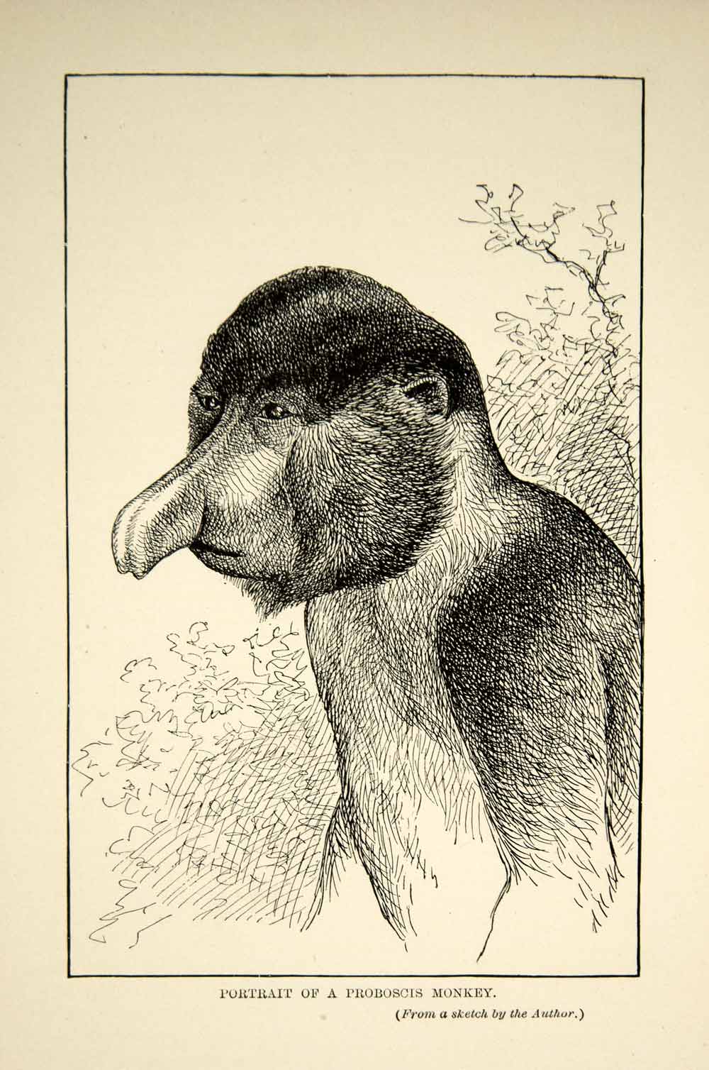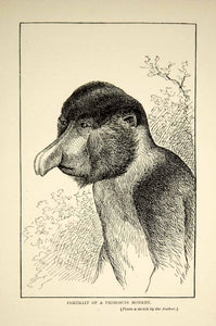 This is an original 1910 black and white wood engraving, from a sketch by American zoologist, William Temple Hornaday, of a proboscis monkey, (Nasalis larvatus) or long-nosed monkey, on the island of Borneo.