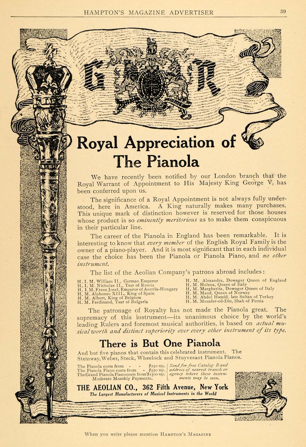This is an original 1911 black and white print ad for the Royal Appreciation of The Pianola, a product of The Aeolian Company, located at 362 Fifth Avenue in New York.