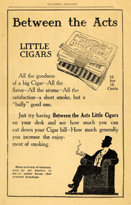 Keywords specific to this image: smoke, smoker, smoking, gentleman, top hat, cane, tux, tuxedo, box, cigarillo, puff, nicotine, tiny, mini Vintage Advertising