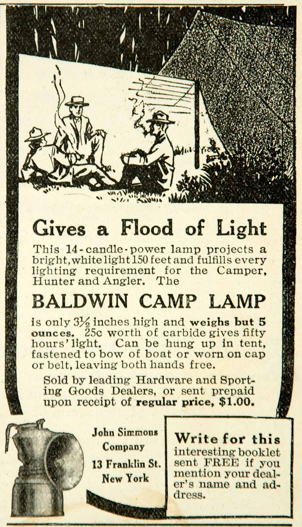 Keywords specific to this image: Vintage Advertising, Camp, Sportsmen, Outdoors, Nature, Recreation, Fishermen, Hunters, Anglers, Smoking, Pipe, Tobacco, Electric, Hardware, Equipment, New York, Street, Night, Light, Illumination
