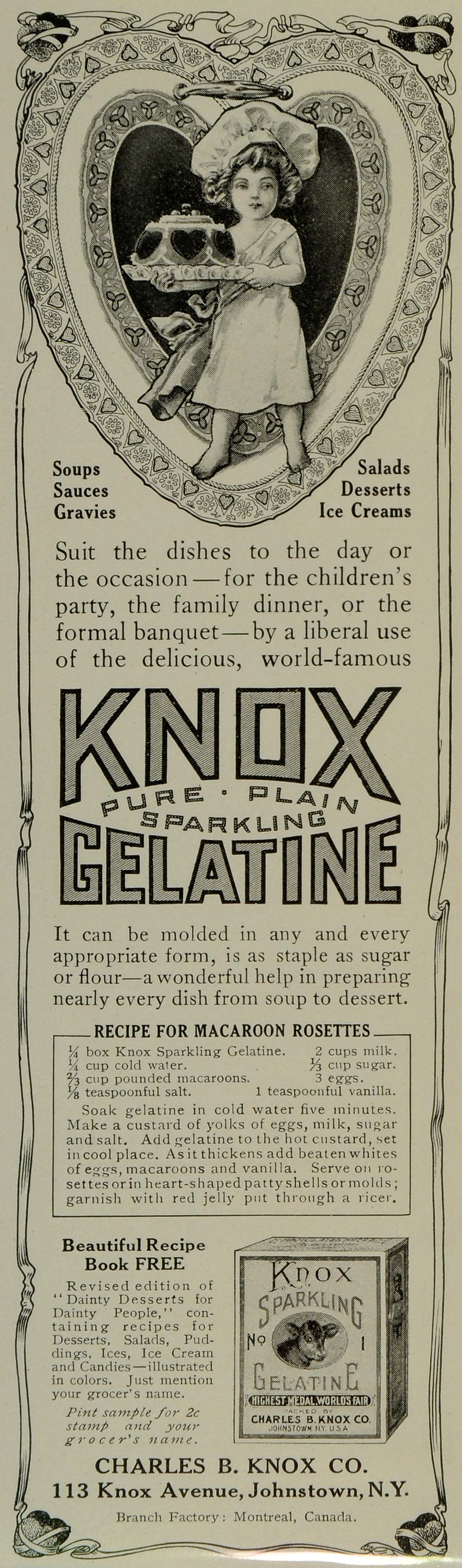 Keywords specific to this image: Vintage Advertising, gelatin, mold, dessert, soup, sauce, gravy, salad, ice cream, cook, cooking, bake, baking, recipe, food, eat, eating, girl, chef, heart, cake