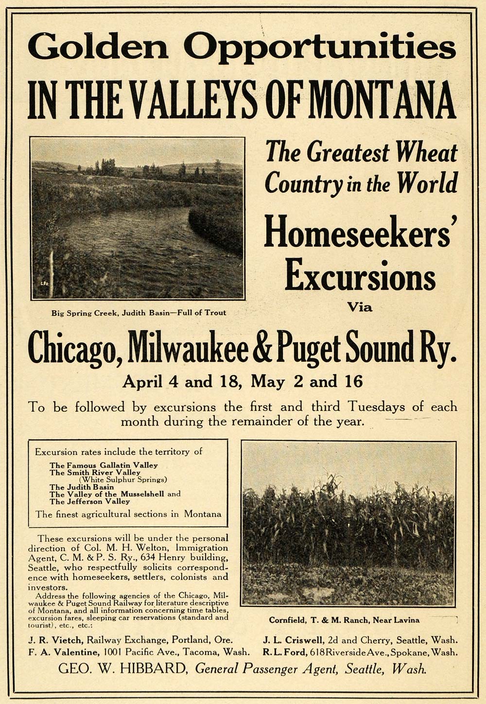 This is an original 1911 black and white print ad promoting agricultural opportunities in the Valley of Montana from Chicago, Milwaukee and Puget Sound Railway.