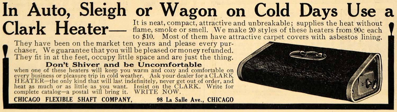 This is an original 1911 black and white print ad for the Clark Heater for autos, sleigh or wagon, by the Chicago Flexibe Shaft Company located at 98 La Salle Avenue, Chicago.