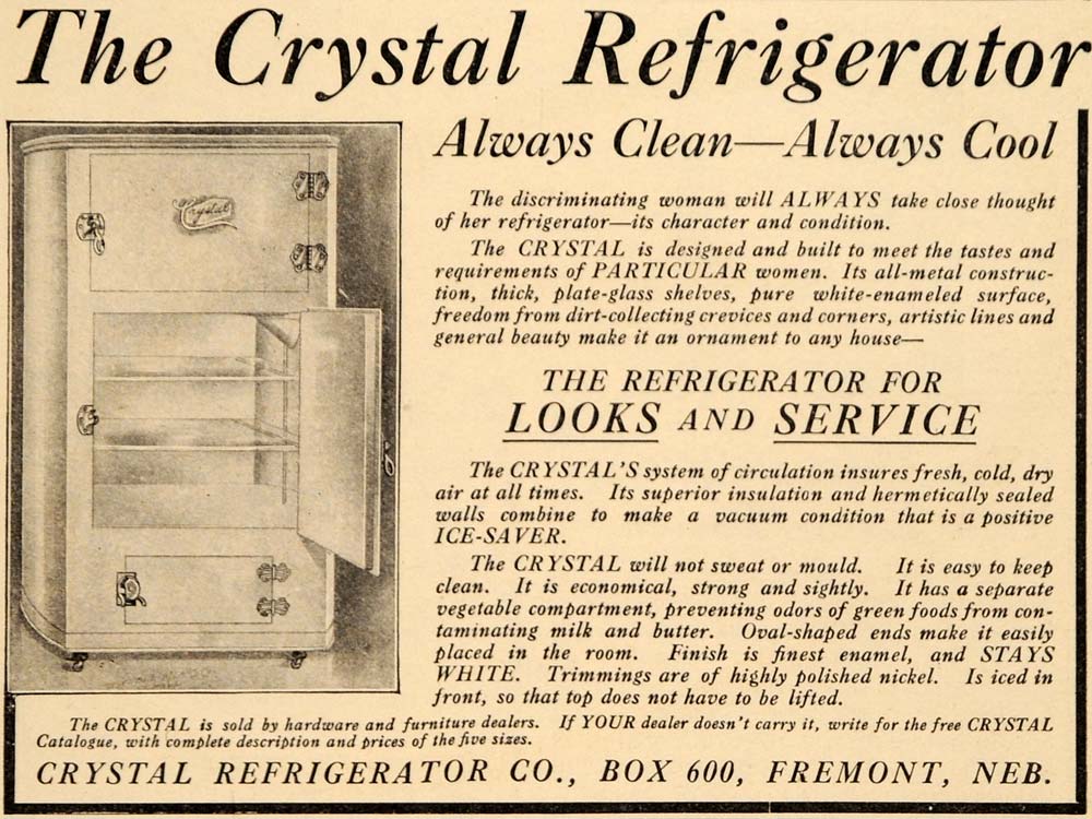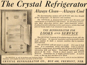 This is an original 1911 black and white print ad for the Crystal Refrigeration Company located in Fremont, Nebraska.