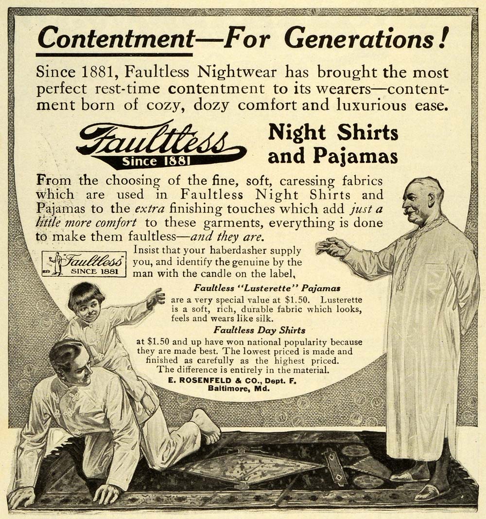 This is an original 1911 black and white print ad for Faultless night Shirts, pajamas and overall nightwear, a product line by E. Rosenfeld and Company in Baltimore, Maryland.