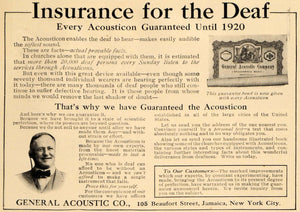This is an original 1911 black and white print ad promoting the health insurance from General Acoustic Company located at 105 Beaufort Street, Jamaica, New York City.