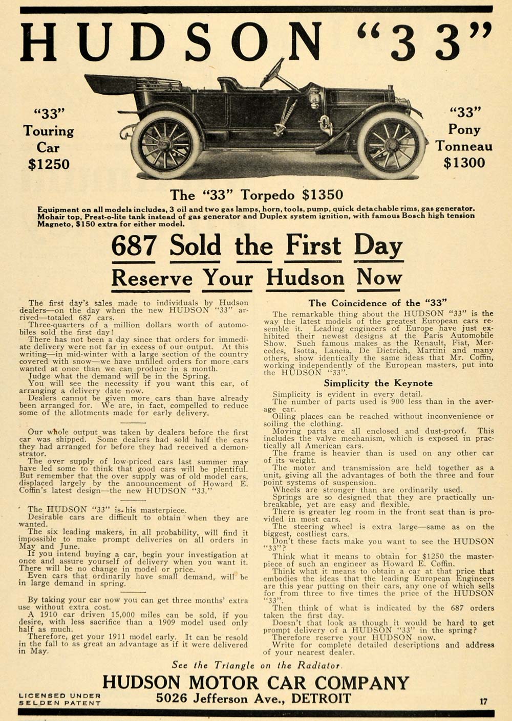 This is an original 1911 black and white print ad for Hudson "33" Touring Car from