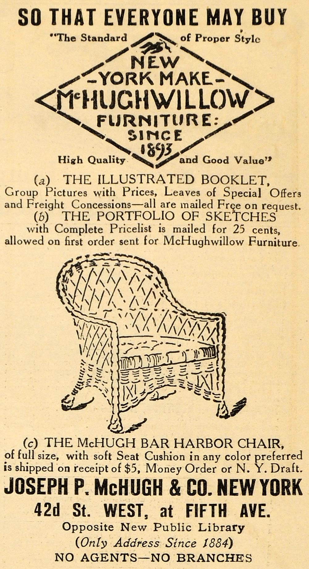 This is an original 1911 black and white print ad for McHugh Willow Furniture, specially featuring the McHugh Bar Harbor Chair, products by Joseph P. McHugh and COmpany, located at 42nd Street West and Fifth Avenue in New York.