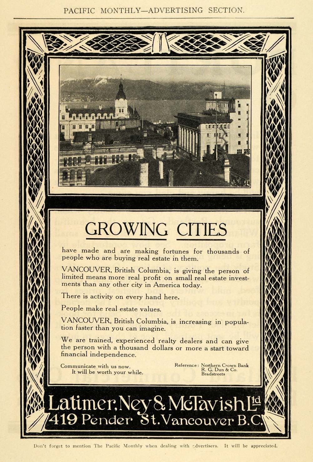 This is an original 1911 black and white print ad for real estate in Vancouver, British Columbia, courtesy of Latimer, Ney & McTavish, located at 419 Pender Street in Vancouver, British Columbia.