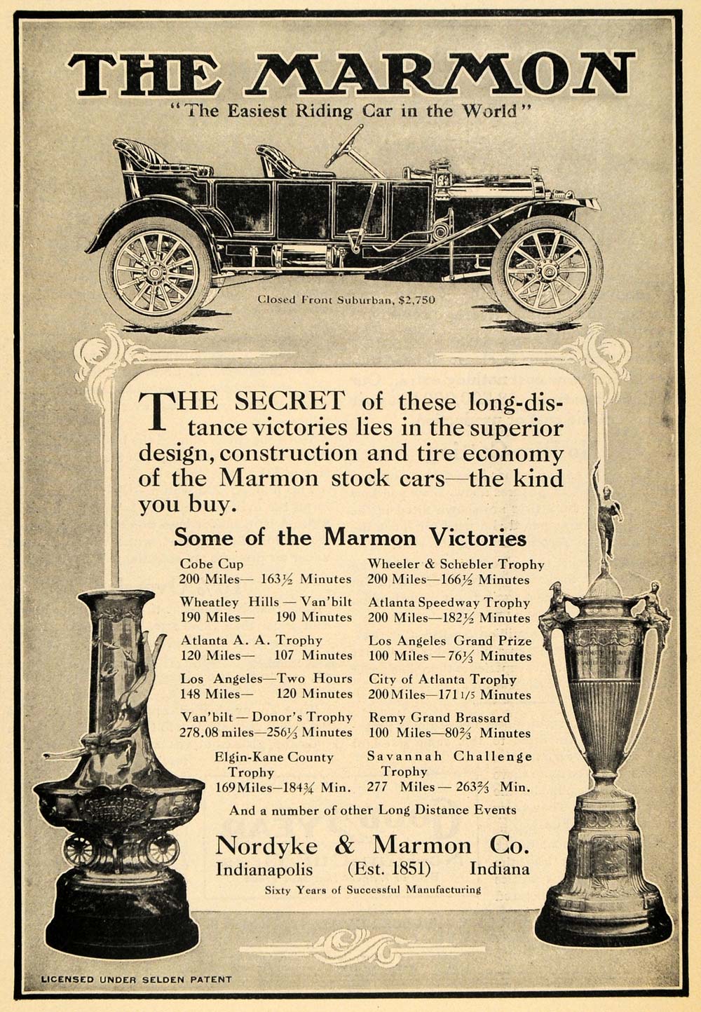 This is an original 1911 black and white print ad for the Marmon Closed Front Suburban automobile by the Nordyke & Marmon Company located in Indianapolis, Indiana. Some of the Marmon victories: Cobe Cup, Wheatley Hills, Atlanta A. A. Trophy, Los Angeles, Van'bilt Donor's Trophy, Elgin-Kane County Trophy, Wheeler & Schebler Trophy, Atlanta Speedway Trophy, Los Angeles Grand Prize, City of Atlanta Trophy, Remy Grand Brassard, Savannah Challenge Trophy.