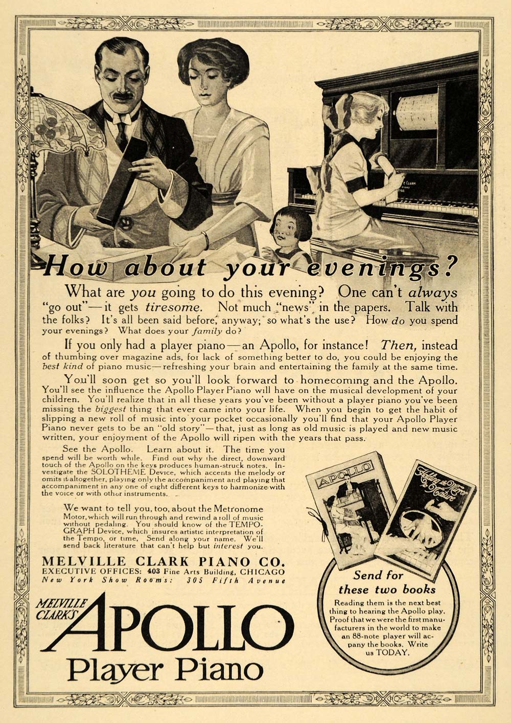 This is an original 1911 black and white print ad for the Melville Clark Piano Company, located at 403 Fine Art Building in Chicago, and whose showroom is at 305 Fifth Avenue in New York. This ad features their Apollo Player PIano.