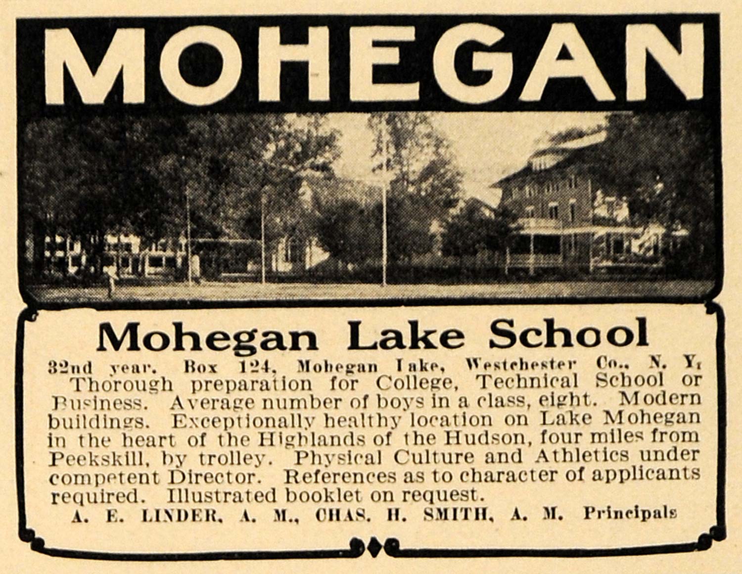 This is an original 1911 black and white print ad for the Mohegan Lake School located in Mohegan Lake, Westchester Co., New York. Information available from A. E. Linder, A. M., Chas. H. Smith, A. M. Principals.