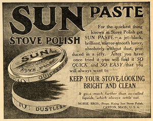 This is an original 1911 black and white print ad for Sun Paste Stove Polish by the Morse Brothers of Canton, Massachusetts.