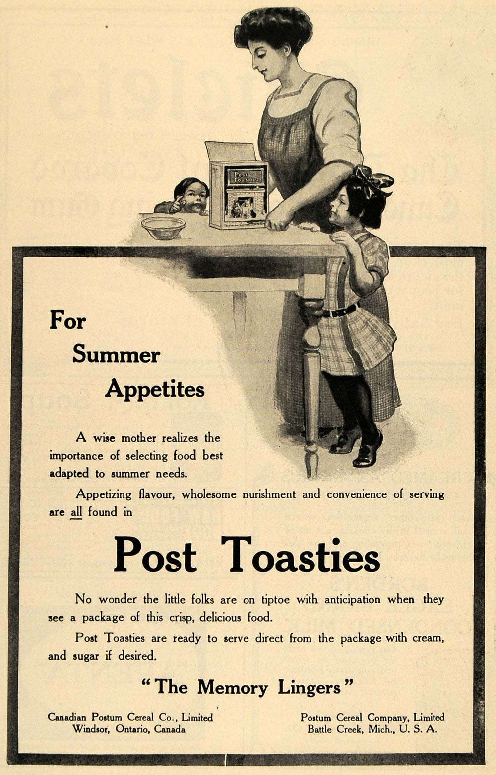 This is an original 1911 black and white print ad for Post Toasties by the Postum Cereal Company, Limited, located in Battle Creek, Michigan. The Canadian Postum Cereal Company, Limited, is located in Windsor, Ontario, Canada.