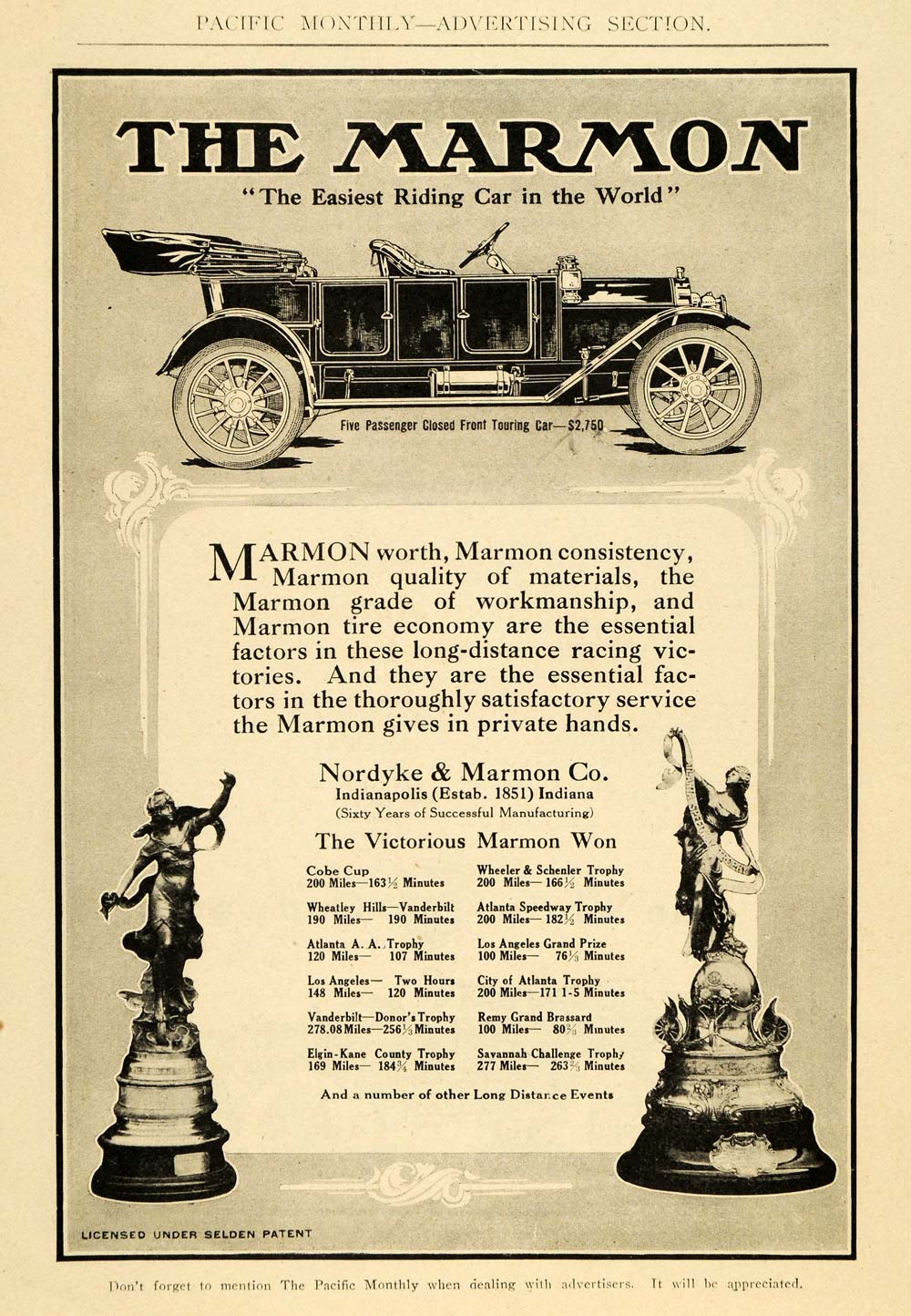 This is an original 1911 black and white print ad for the Marmon, an automobile by Nordyke & Marmon Company in Indianapolis, Indiana. This particular ad features the five passenger closed front touring car.