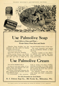 This is an original 1911 black and white print ad for Palmolive Soap and Palmolive Cream, a product line by B. J. Johnson Soap Company, located at 386 Fowler Street in Milwaukee, Wisconsin.