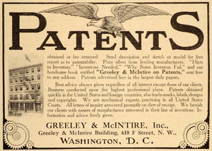 This is an original 1911 black and white print ad for patents from Greeley & McIntire, Inc., Greeley & McIntire Building, 618 F. Street, N. W., Washington, D. C.