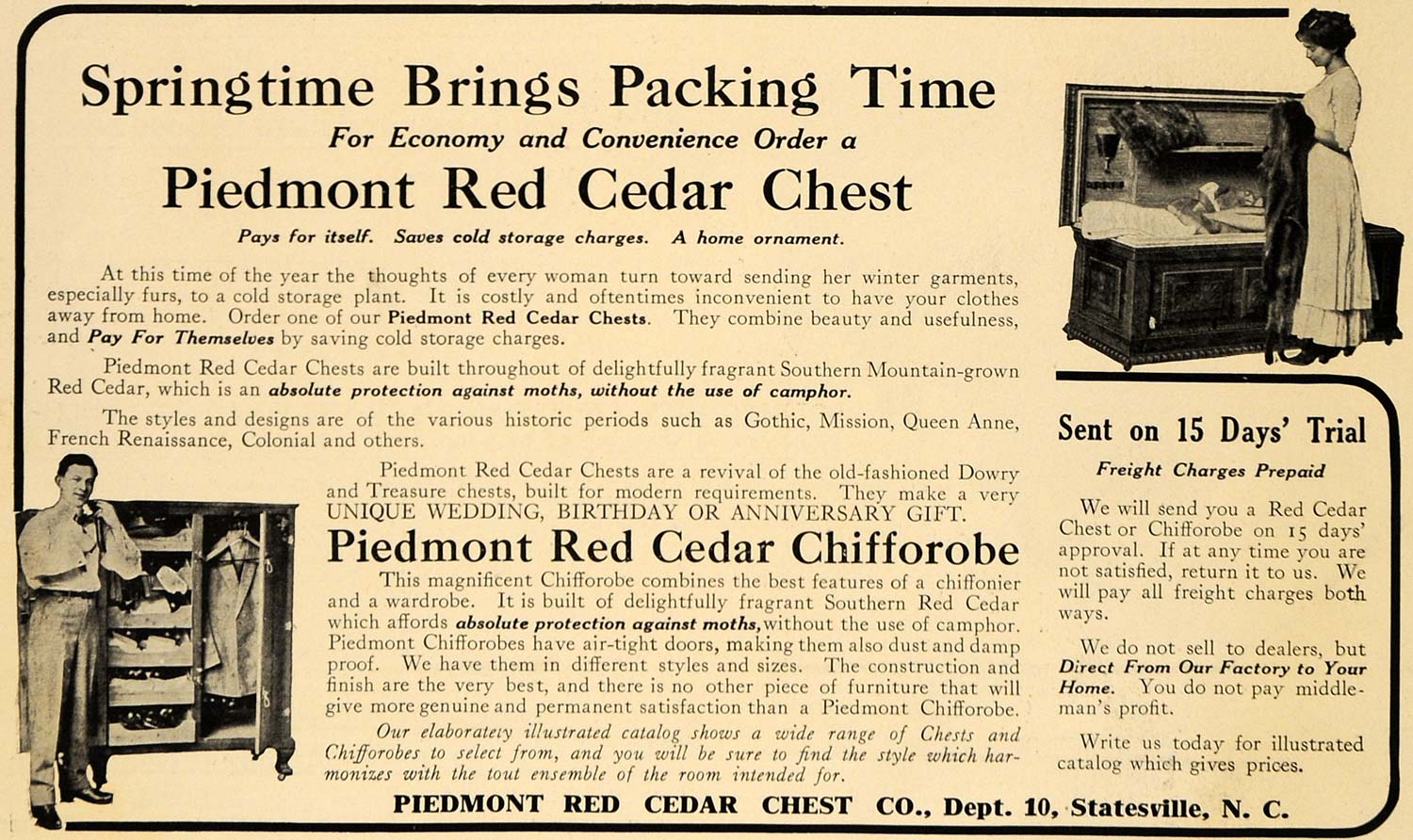 This is an original 1911 black and white print ad for the Piedmon Red Cedar Chests, Highboys, Lowboys and Chifforobes from Piedmont Red Cedar Chest Company located in Statesville, North Carolina.