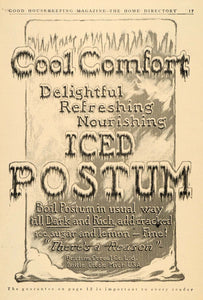 This is an original 1911 black and white print ad for Iced Postum from the Postum Cereal Company of Battle Creek, Michigan. The ad writes, "Boil Postum in usual way til dark and rich, add cracked ice, sugar and lemon-- fine!"