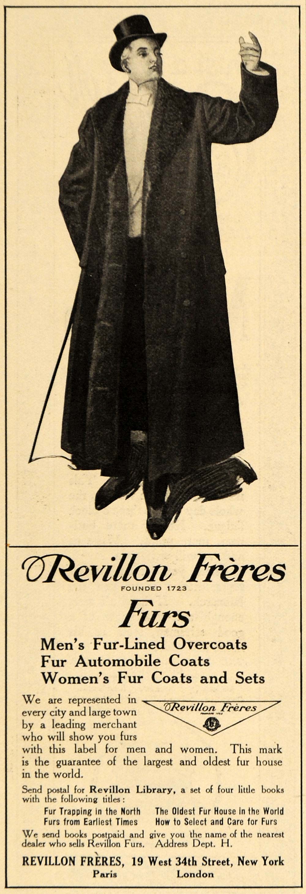 This is an original 1911 black and white print ad for Revillon Freres Furs, makers of men's fur line overcoats, fur automobile coats, women's fur coats and sets. Revillon Freres is located at 19 West 34th Street, New York City. Founded in 1723.
