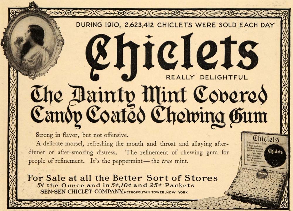 This is an original 1911 black and white print ad for the Chiclets Dainty Mint Covered Candy Coated Chewing Gum from Sen-sen Chiclet Company located in New York.