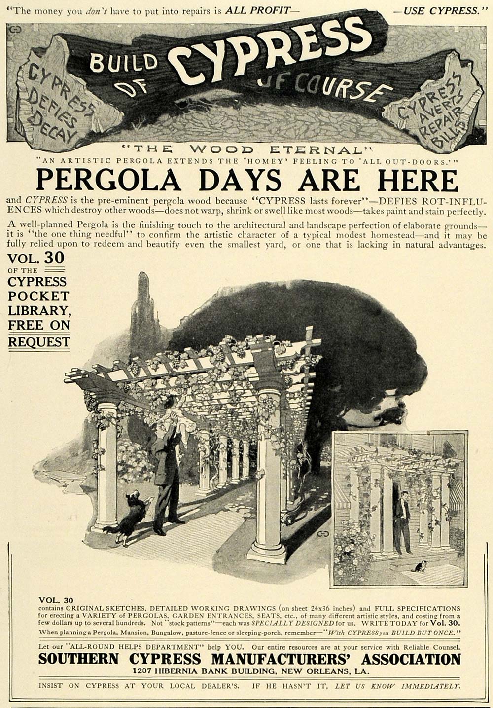 This is an original 1911 black and white print ad for the Southern Cypress Manufacturers' Association, featuring their line of Pergolas.