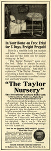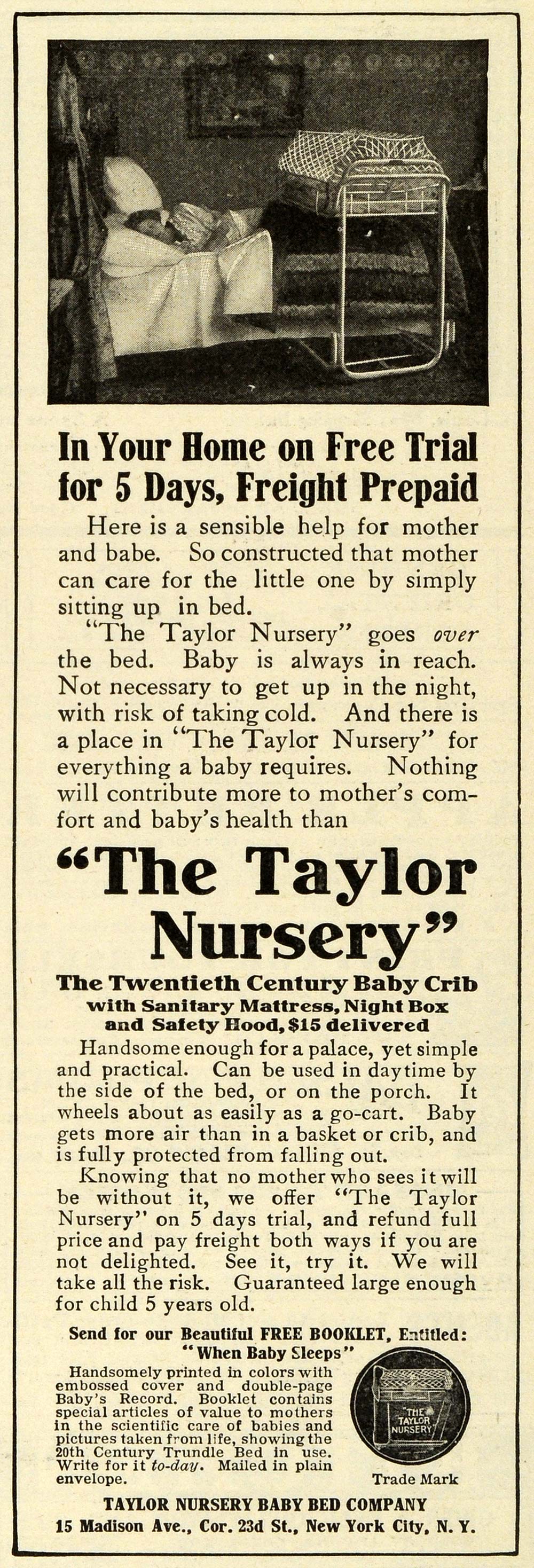 This is an original 1911 black and white print ad for The Taylor Nursery with Sanitary Mattress, Night Box and Safety Hood, a product by the Taylor Nursery Baby Bed COmpany, located at 15 Madison Avenue and the Corner of 23rd Street in New York City.