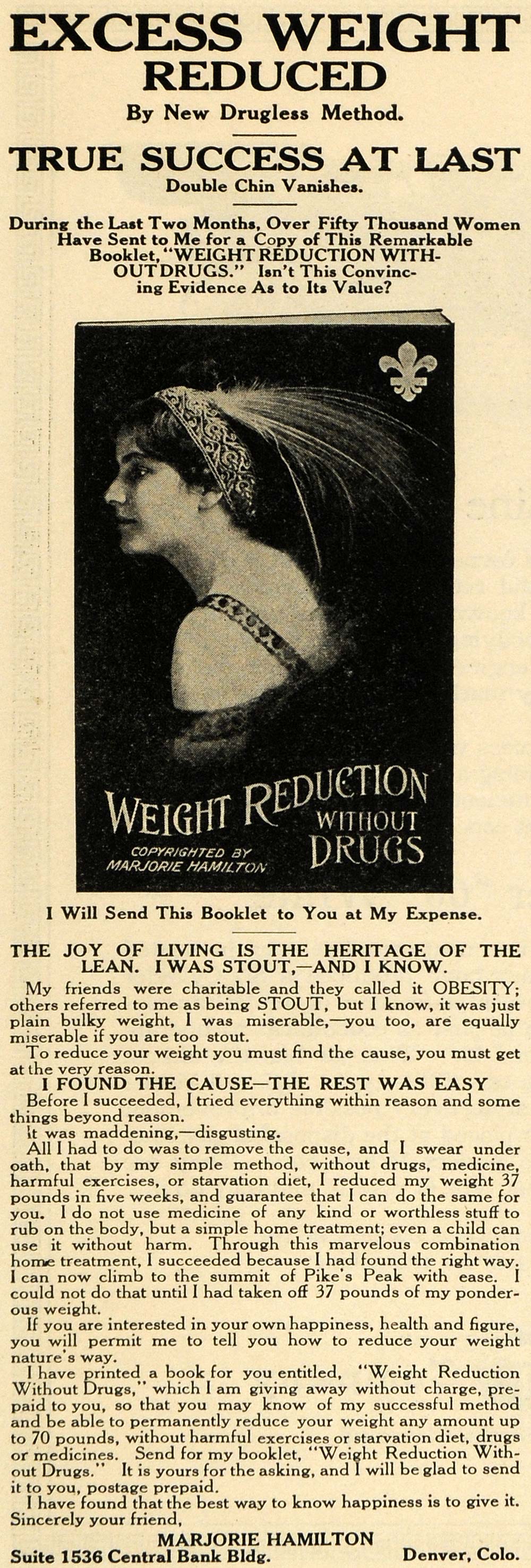 This is a small original 1911 black and white print ad for Marjorie Hamilton of Denver, Colorado. The ad is for weight reduction without drugs. The ad writes, "All I had to do was to remove the cause, and I swear under oath, that by my simple method, without drugs, medicine, harmful exercises or starvation diet, I reduced by weight 37 pounds in five weeks..."