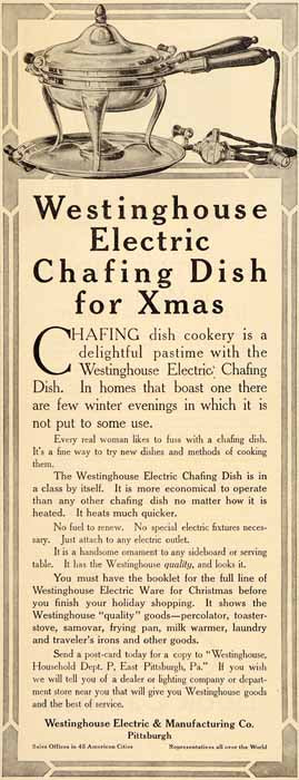 This is an original 1911 black and white print ad for the Westinghouse Electric Chafing Dish from the Westinghouse Electric and Manufacturing Company.