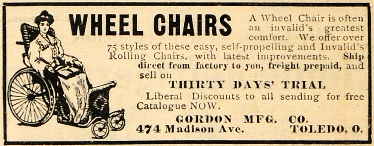 This is an original 1911 black and white print ad for wheel chairs by the Gordon Manufacturing Company located at 474 Madison Avenue, Toledo, Ohio.