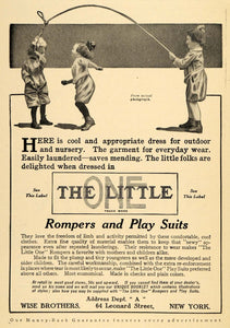 This is an original 1911 black and white print ad for the Little Ones Play Suits and Rompers from Wise Brothers located at 64 Leonard Street, New York.