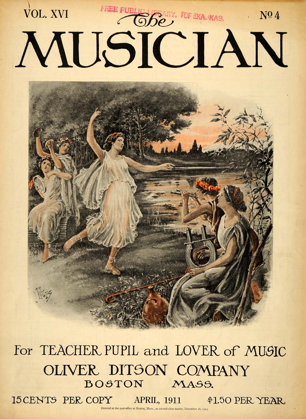 This is an original 1911 color cover for The Musician Magazine for April (Volume XVI, No. 4) from the Oliver Ditson Company of Boston, Massachusetts. This cover features artwork by an unknown artist (only distinguishable by the signature "Willis").CONDITION