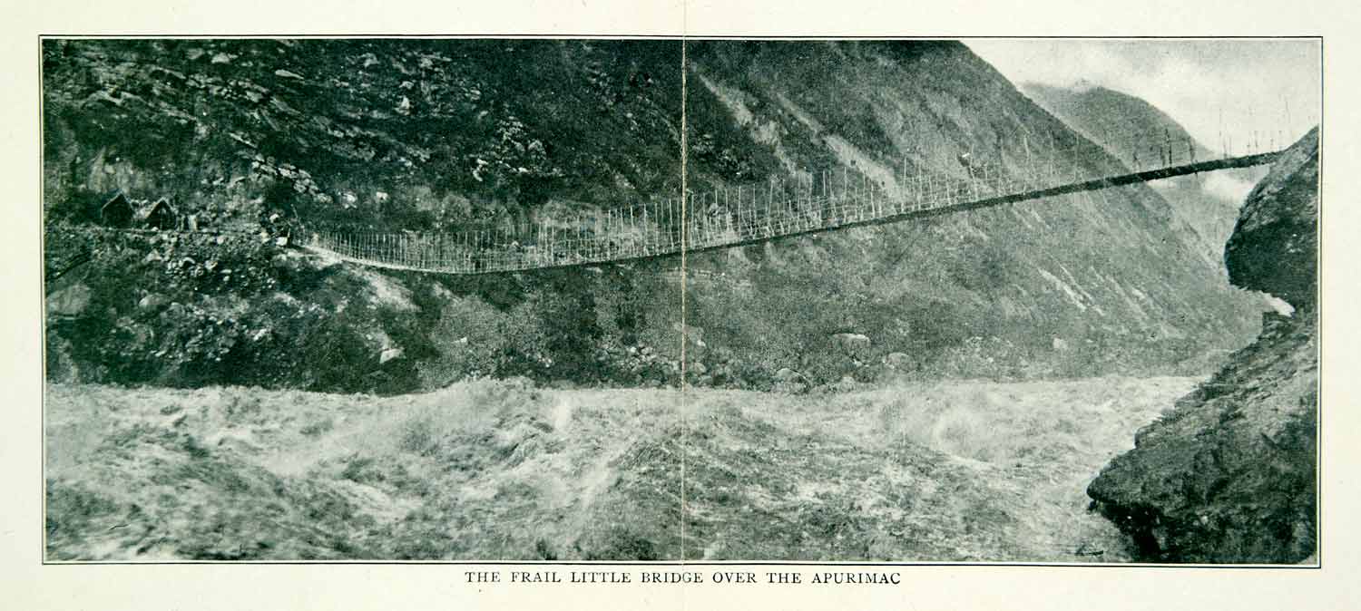 This is an original 1911 black and white halftone print that depicts a tiny little bridge draped across the churning waters of the Apurimac River in Peru.