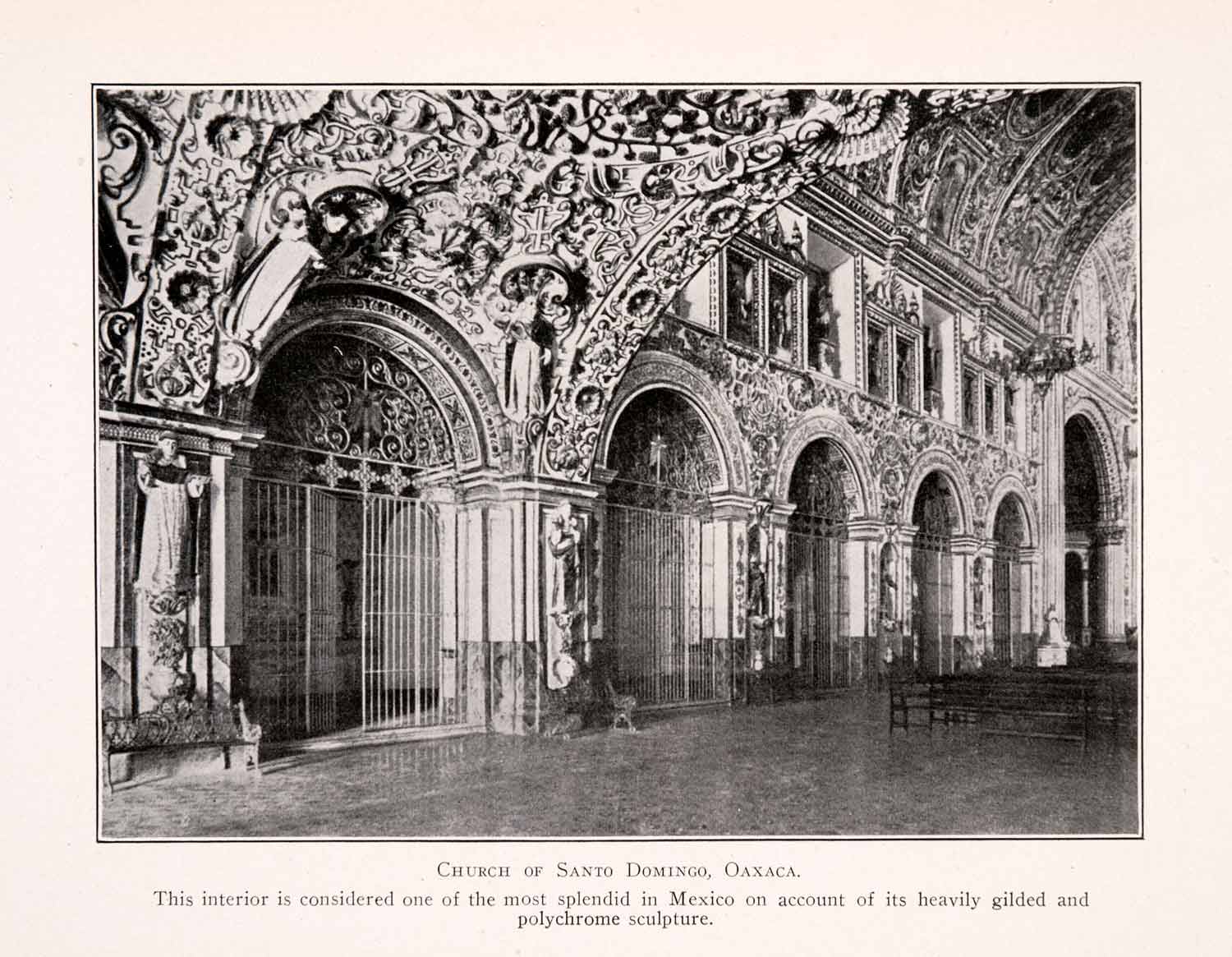 This is an original 1911 black and white halftone print of "Church of Santo Domingo, Oaxaca." Considered one of the most magnificent interiors of Mexico, the Church (and former monastery) of Santo Domingo de Guzán is a baroque church with an extensively gilded interior in addition to polychrome sculpture.