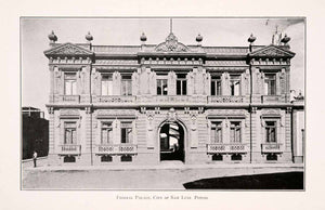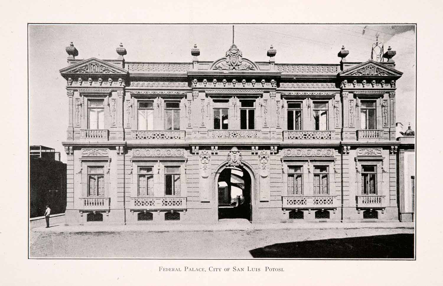 This is an original 1911 black and white halftone print of "Federal Palace, City of San Luis Potosi." Located in front of the San Luis Potosi Teatro de la Paz (The Theater of Peace), the Federal Palace reflects the economic prosperity the region experienced in the nineteenth century. The building is situated in the historic center of the city on the Plaza de Armas.