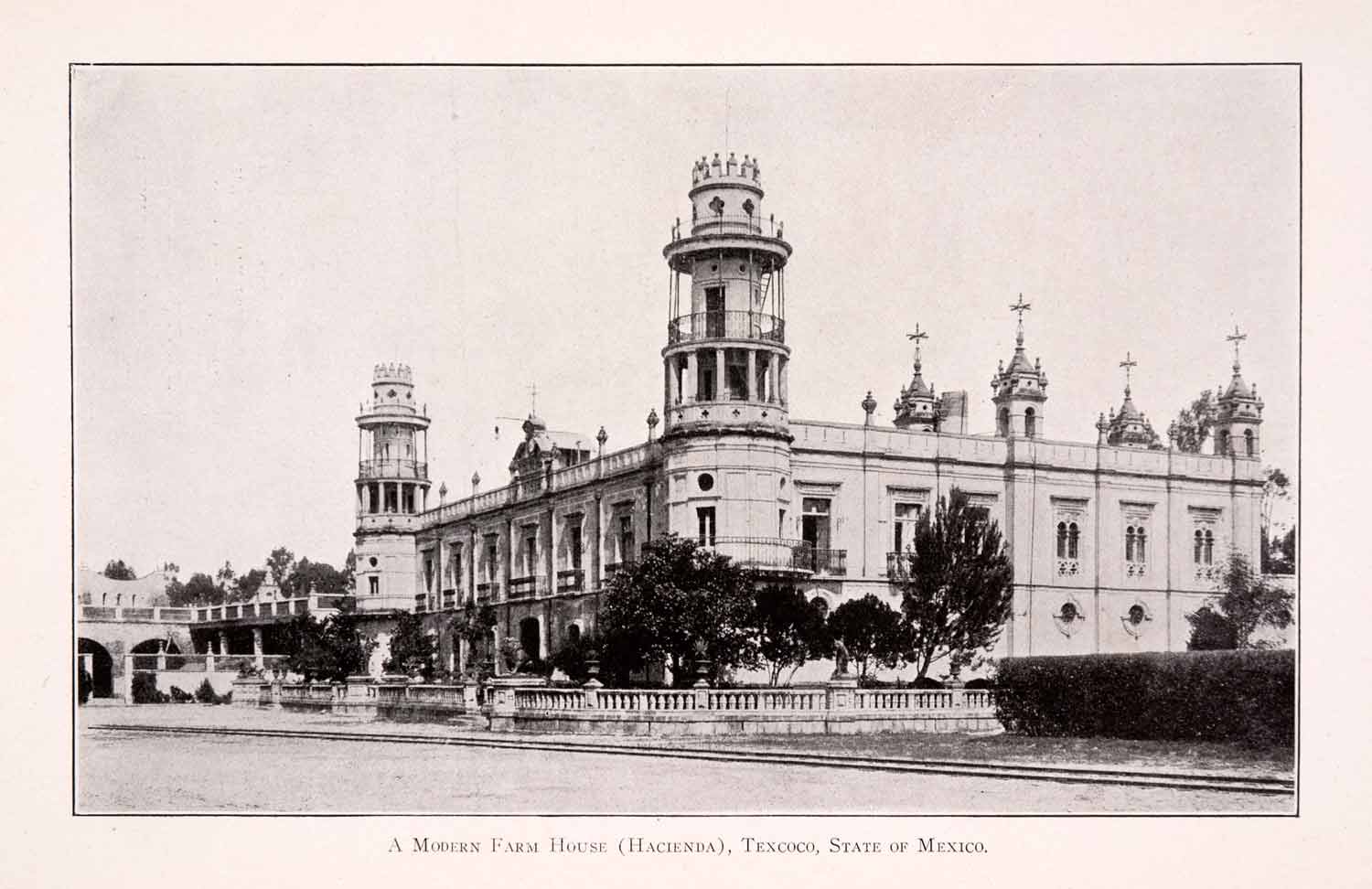 This is an original 1911 black and white halftone print of "A Modern Farm House (Hacienda), Texcoco, State of Mexico." This image brings an entirely new meaning to the term "farm house." In actuality, the translation of "hacienda" means estate, generally being applied to estates similar to the historic plantations of the United States, but also encompassing mines and business factories.