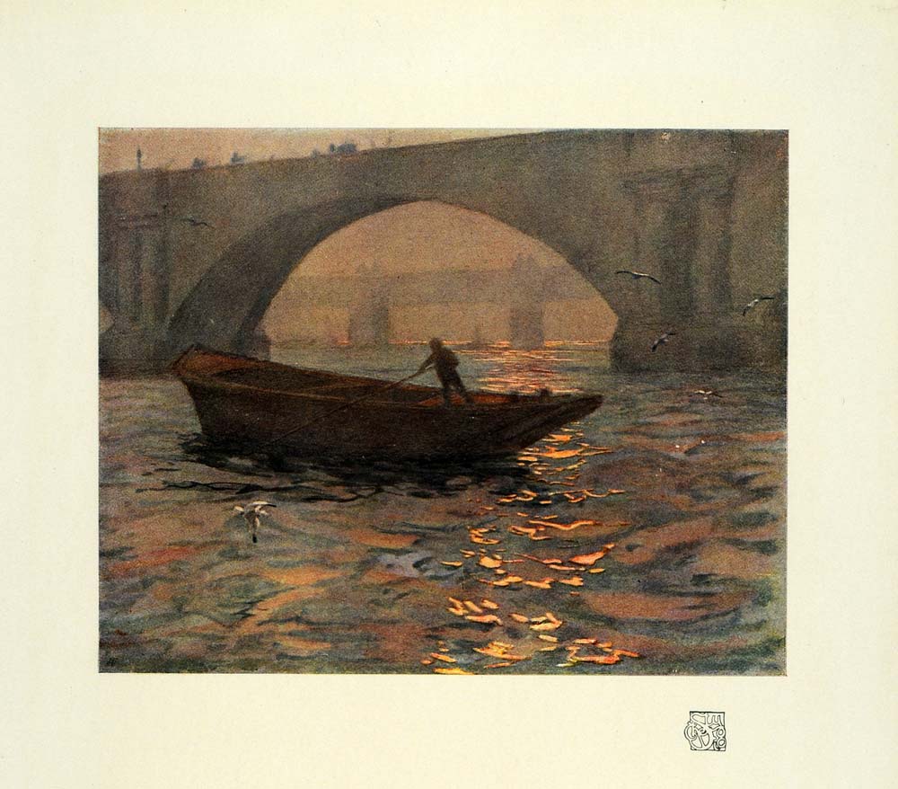 Keywords specific to this image: river, waterway, structure, city, water, birds, gulls, sunset, dusk, evening, seagulls, boat, boating, punt, vessel, pole, English, England, British, Britain, Europe, travel, transport