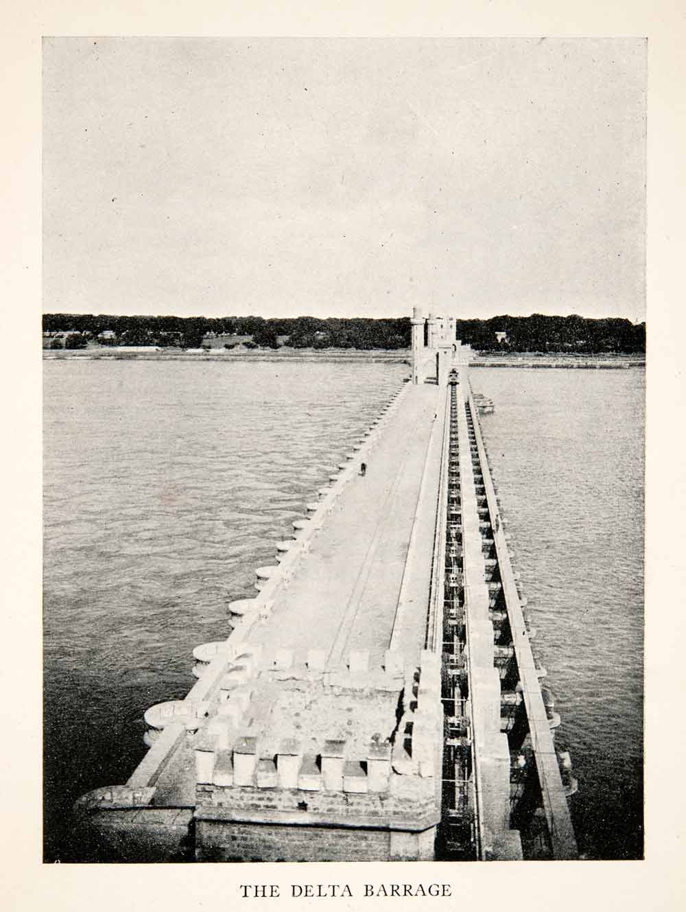 This is an original 1911 black and white halftone print of the Delta Barrage in Egypt. This structure, erected in 1862, was originally constructed to improve irrigation in the Delta Nile region.