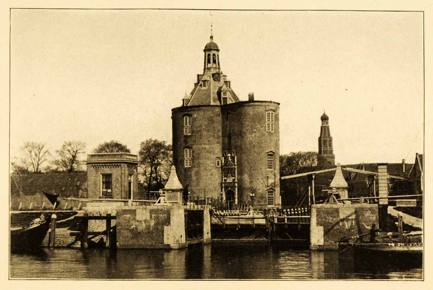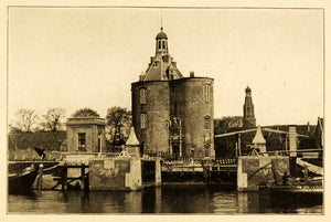 This is an original 1911 sepia halftone print of the Drommedaris Tower in Enkhuizen, Holland.