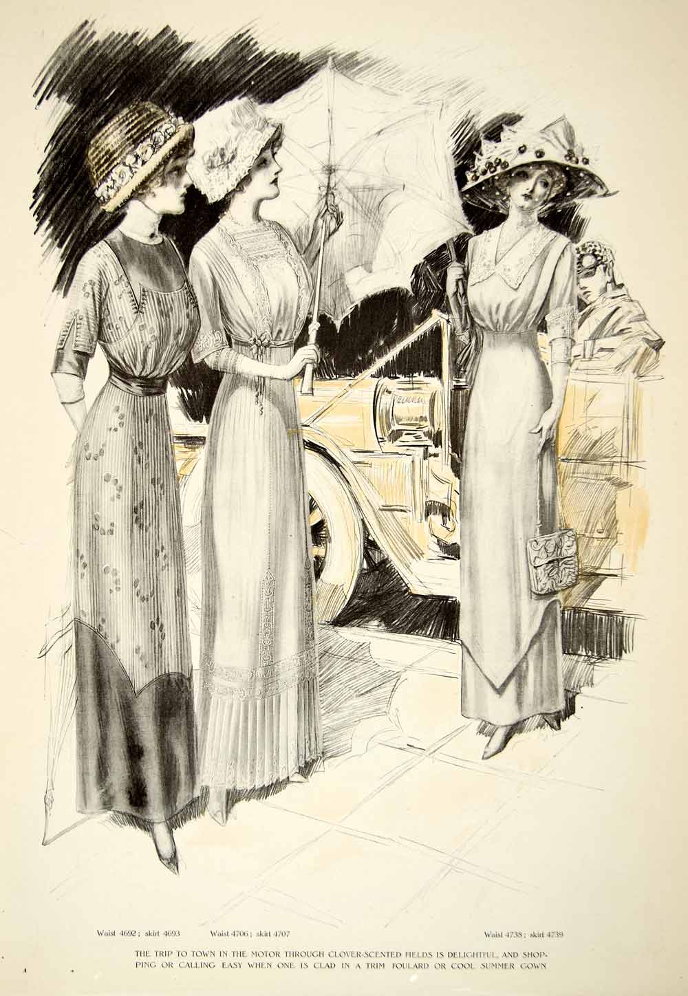 This is an original 1911 two-color halftone print that depicts three beautiful summer gowns, perfect for a cool drive through the clover fields.