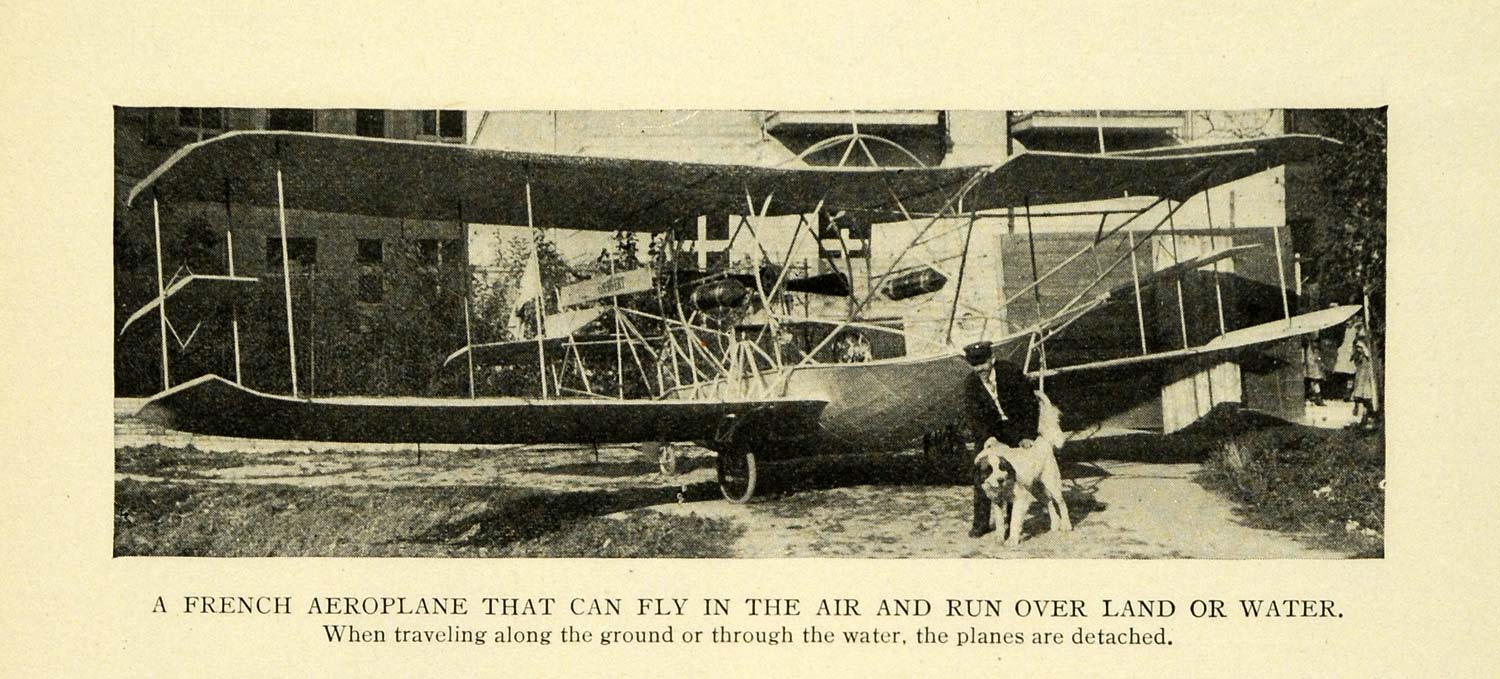 This is an original 1911 halftone print of a French airplane that was able to fly in the air and drive on land or water. The caption writes, "When traveling along the ground or through the water, the planes are detached."