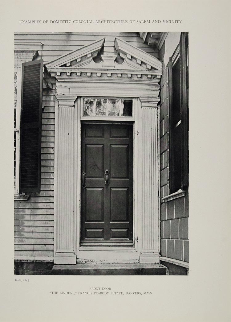 This is an original 1911 halftone print of the front door to "The Lindens," the Francis Peabody Estate in Danvers, Massachusetts, built in 1745 (1754?) for "King" Hooper. It also served as the headquarters of the British General and Massachusetts Governor, General Thomas Gage, in 1774. The house was moved to the Kalorama neighborhood of Washington, D.C. in 1935.