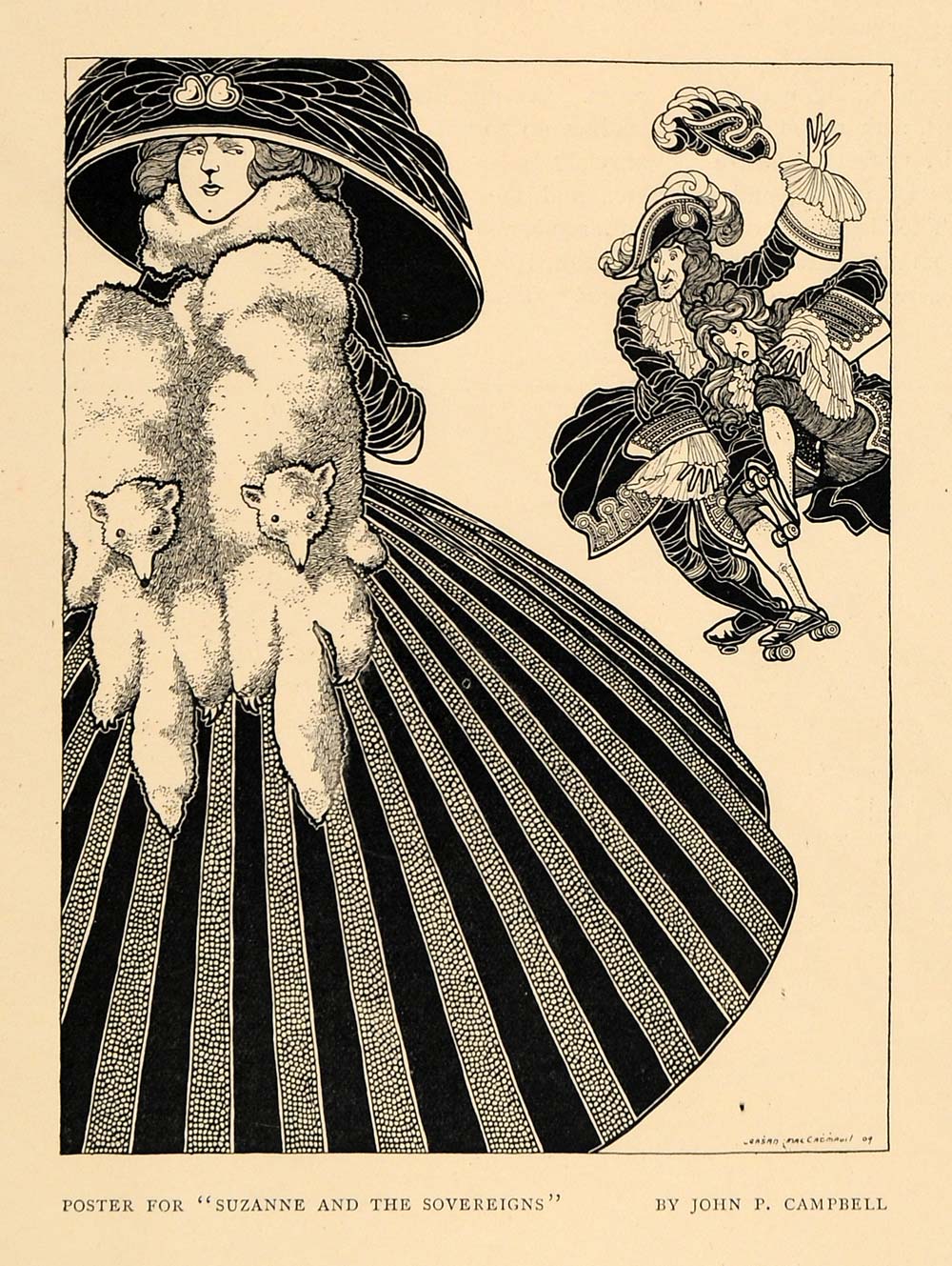 This is an original 1911 halftone print of "Suzanne and the Sovereigns," by John P. Campbell. Campbell was a native of Belfast, and sometimes signed his work under the name, "Seaghan MacCathmhaol". The image features William III and John II chasing after Lady Suzanne. Please note there is printing on the reverse.