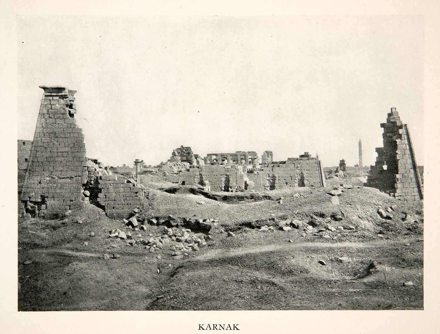 This is an original 1911 black and white halftone print of a historic image of ancient ruins at Karnak in Egypt.