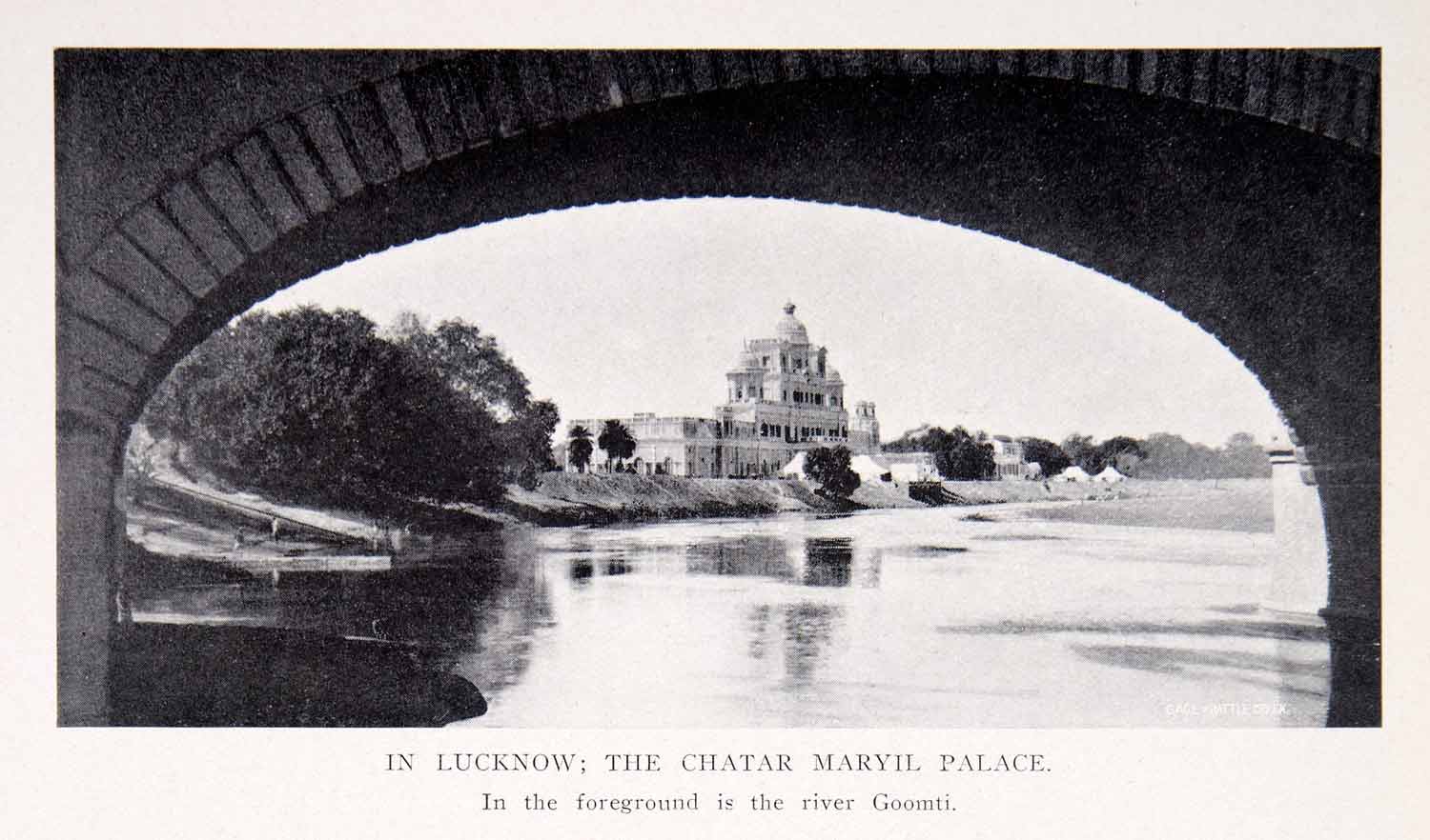 This is an original 1911 black and white halftone print of "In Lucknow; The Chatar Maryil Palace."