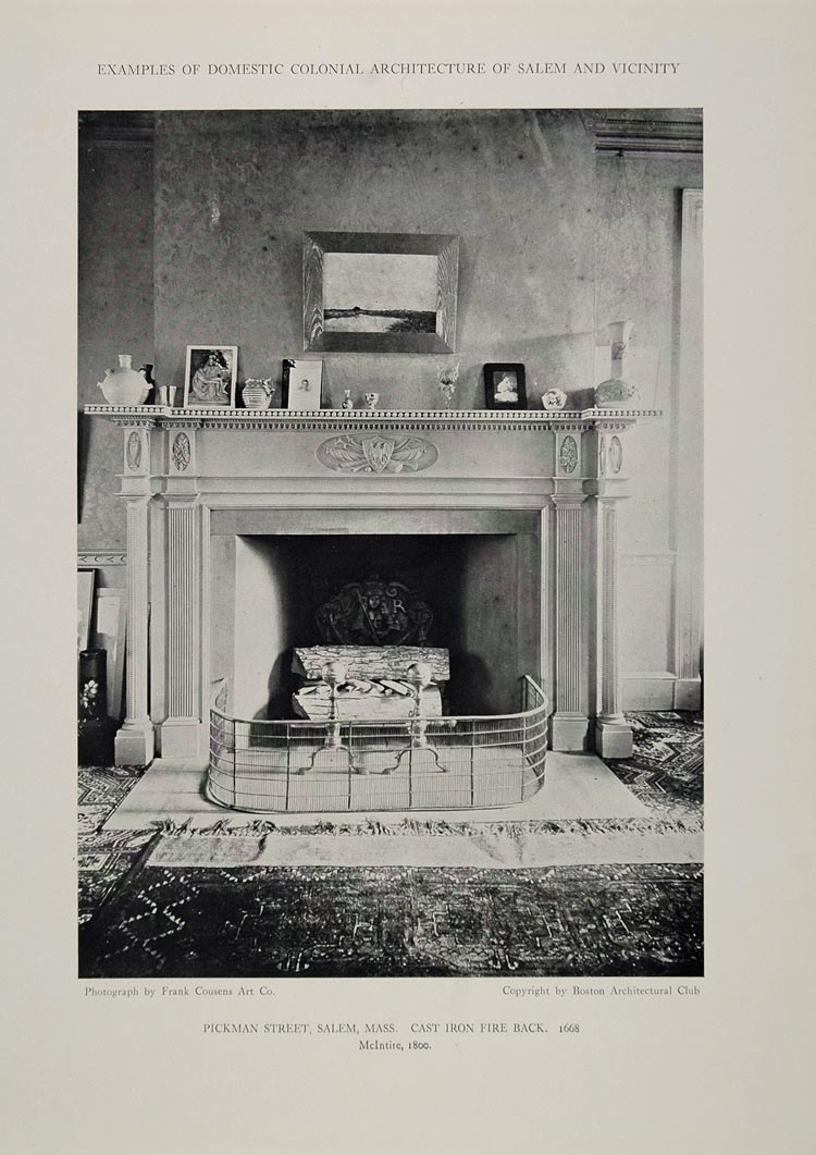 This is an original 1911 halftone print of the mantel and the cast iron fire back in a historic house on Pickman Street in Salem, Massachusetts. Architect: Samuel McIntire.