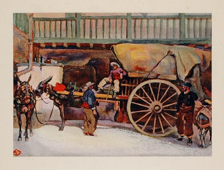 This is an original 1911 color tipped-in print of men with a wagon in the patio of a posada in Spain. (Please note that the dimensions given are of the actual print which is tipped-in on a paper stock which measures approx. 6.5 x 9.5 inches.)