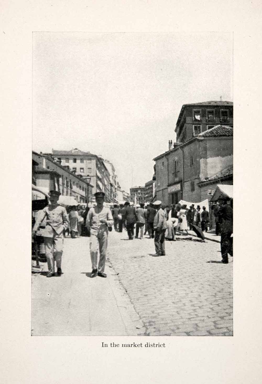 This is an original 1911 black and white halftone print of a marketplace in Seville (Sevilla), Spain. This city is located in the region of Andalusia and is the fourth largest city in Spain. The area has been occupied for thousands of years and was first colonized by Phoenicians.