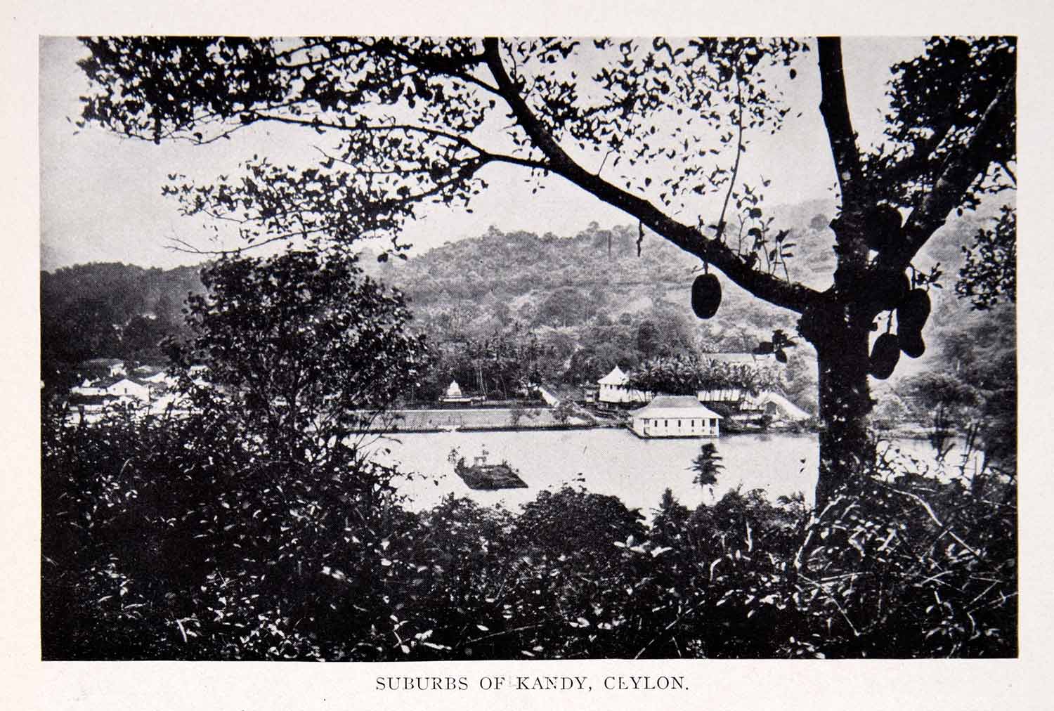 This is an original 1911 black and white halftone print of the "Suburbs of Kandy, Ceylon (Sri Lanka).