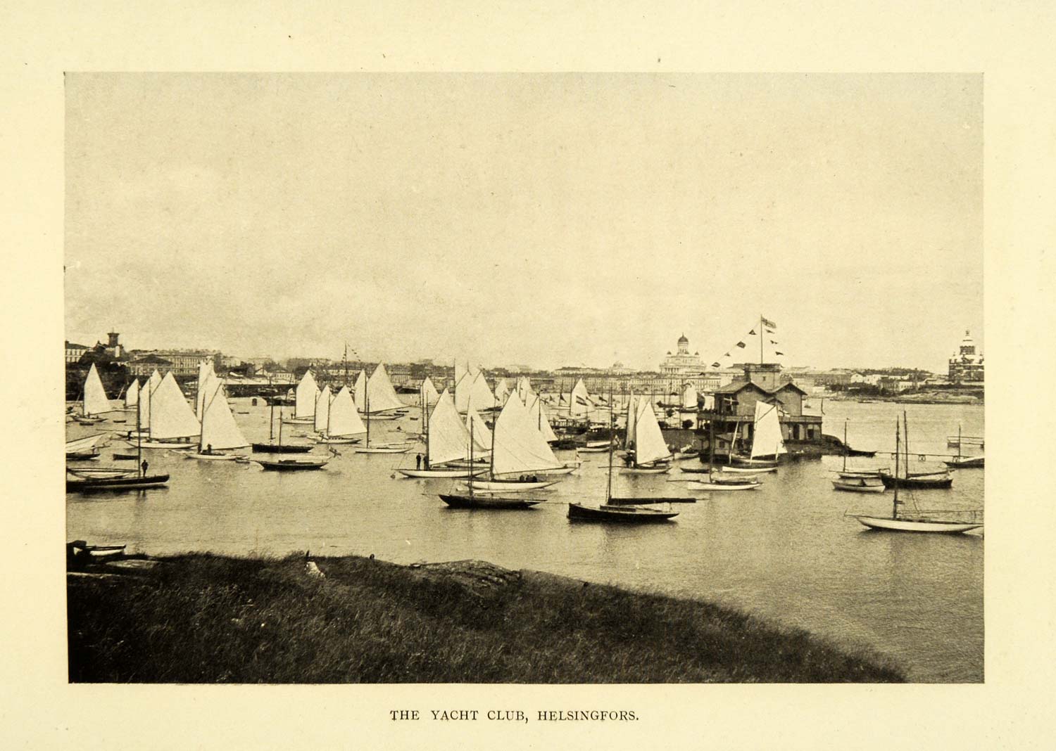 This is an original 1911 halftone print of a yacht club in Helsinki (Helsingfors), Finland (Suomi).